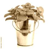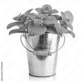 Fresh green mint in iron bucket. Organic natural food growing. Isolated on white background. Thime, basil and leaves harvest.