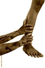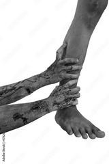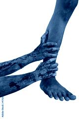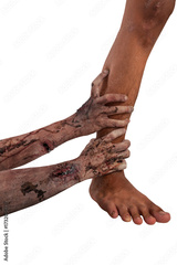 The zombies hand with wounds and blood catches a human foot isolated over a white background. Zombie, devil, evil, satan, or monster hand. Concept of Halloween or Horror