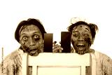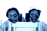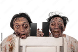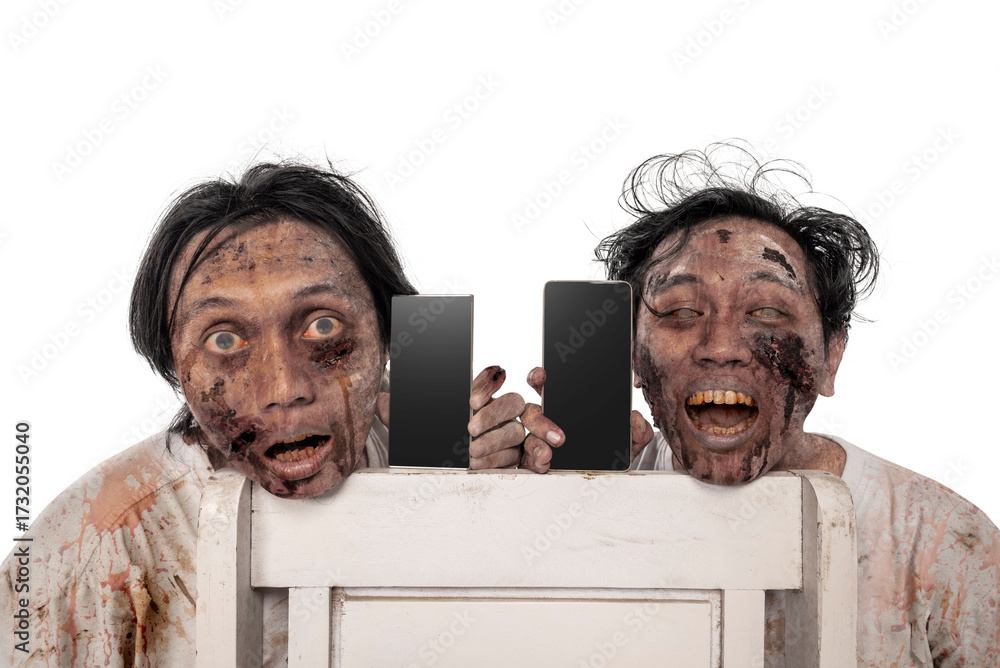 Portrait of two scary male zombies with a wound and blood on their bodies holding a cellphone isolated over a white background. Mockup or Copy space. Spooky expression. Concept of Halloween or Horror