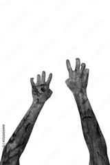 The zombies hand with wounds and blood try to reach something isolated over a white background. Zombie, devil, evil, satan, or monster hand. Concept of Halloween or Horror