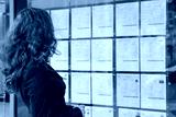 A woman with vibrant red hair is reading job postings displayed on a glass window during the daytime