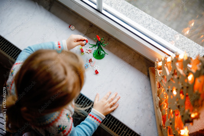 Little toddler girl sitting by window decorating small glass Christmas tree with tiny toys. Happy child celebrating family holiday tradition. Adorable baby, cozy festive moment
