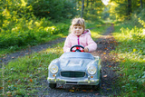 Little preschool girl driving big vintage toy car. Happy child having fun with playing outdoors. Active preschooler child enjoying warm autumn day in forest. Smiling stunning kid playing