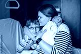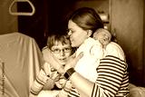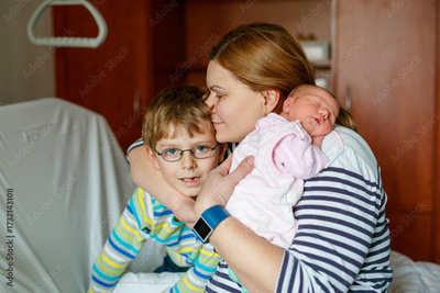 Happy little boy kissing his sleeping newborn sister in hospital bed. Mother holding baby girl on arm. Real life, real people moment of sibling love, bonding, and family tenderness