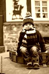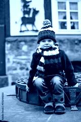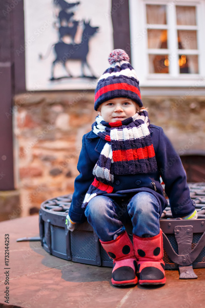 Cute little smiling kid boy on christmas market in old city of Germany. Happy child in winter clothes on German xmas market with lights on background on winter day.