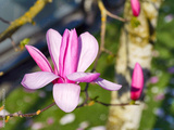 Blossoming magnolia tree flower on green lawn background
