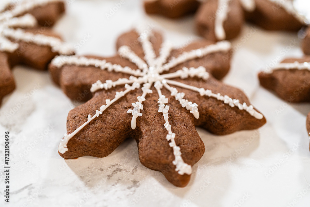 Decorating Snowflake Chocolate Ginger Sugar Cookies with Royal Icing and Sugar Crystals