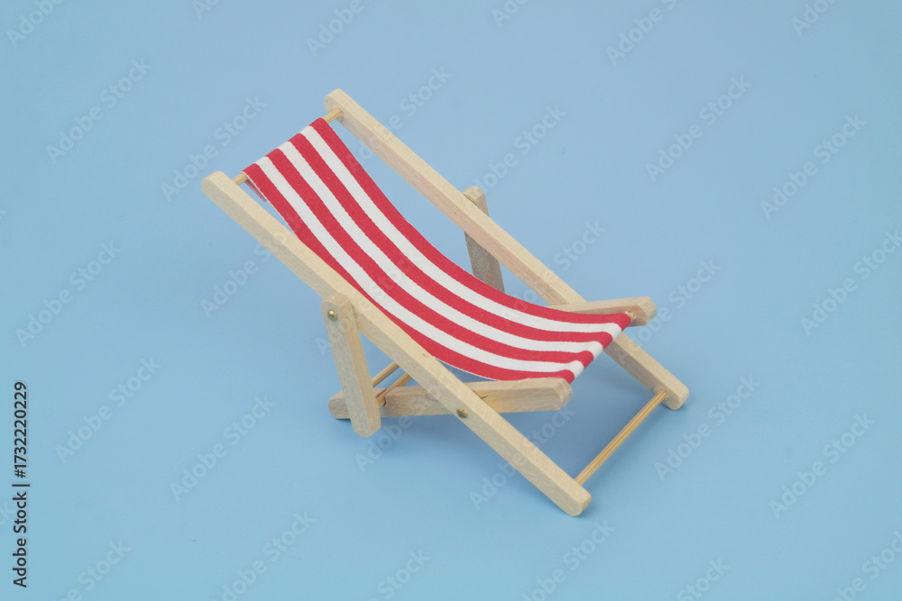 Red beach chair on blue background. Copy space for text. Travel and vacation concept.