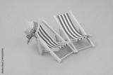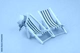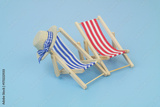 Blue and red beach chairs with hat on blue background. Copy space for text. Travel and vacation concept.
