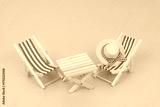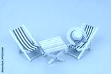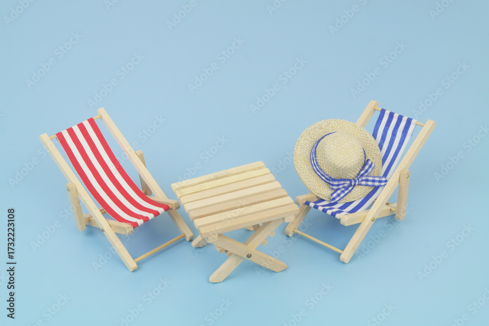 Blue and red beach chairs with hat and wooden table on blue background. Copy space for text. Travel and vacation concept.