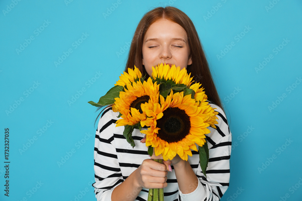 Teenage girl with bouquet of beautiful sunflowers on light blue background
