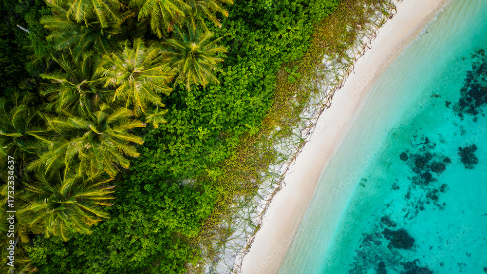 Aerial view of tropical beach with turquoise ocean, white sand, and lush palm trees, creating an idyllic paradise island scene perfect for travel, vacation, and commercial use.