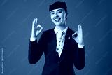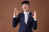 Charming stewardess showing okay gestures on brown background