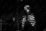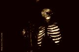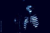 Hooded skeleton reaper holds a scythe with bright green ribs and eyes at night. Spooky Halloween yard display with dramatic lighting and shadows.