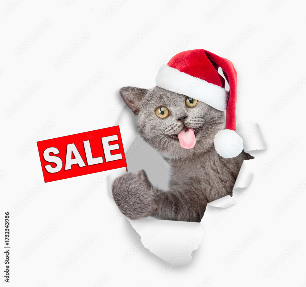 Funny cat with tongue out wearing red santa hat looking through the hole in white paper and showing signboard with labeled "sale"