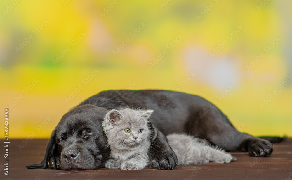 Sleepy Black labrador puppy hugs tiny kitten at summer park