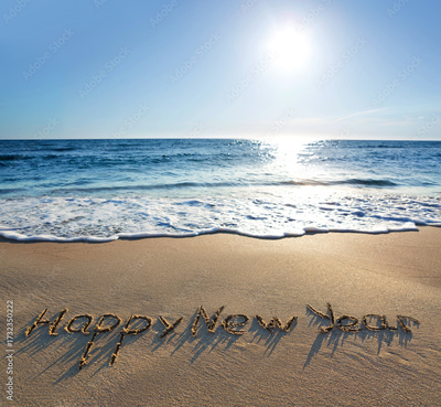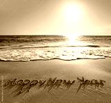 Happy New Year lettering on the sunny beach sand.