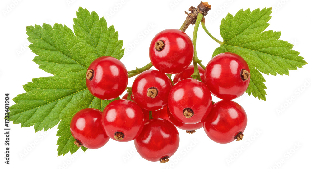 Redcurrant berries isolated on transparent background, vibrant and juicy fruit with green leaves for healthy eating and summer themes