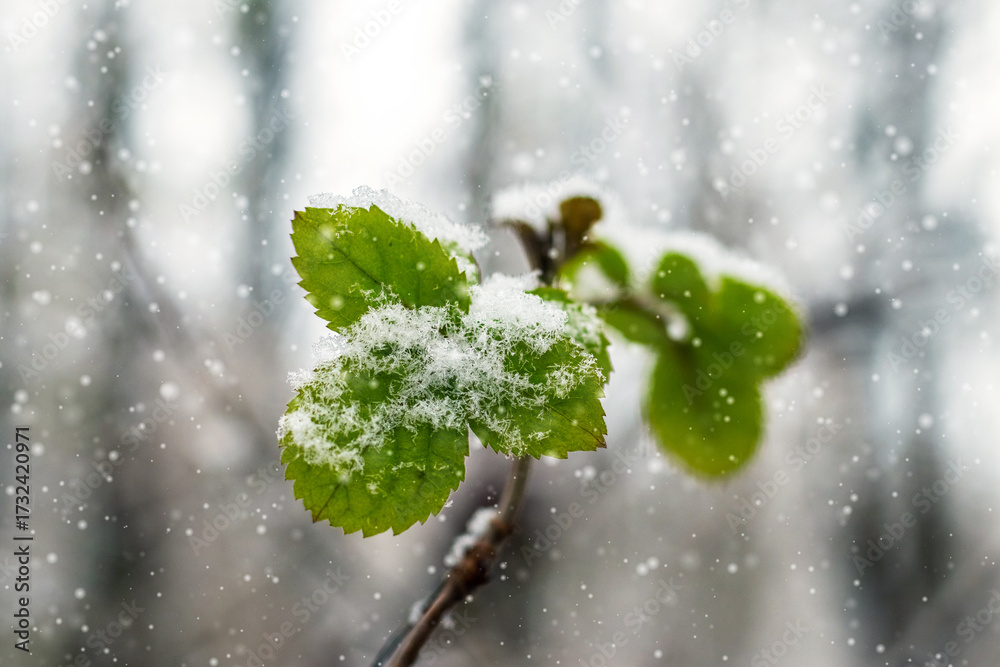 The first snow on green leaves of a bush, creating a contrast between autumn nature and the beginning of winter