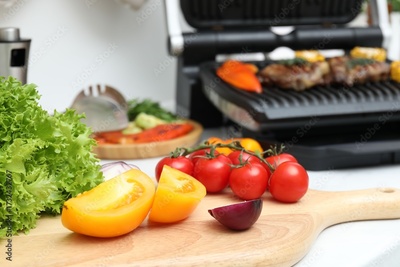 Electric grill with tasty meat and vegetables on white table indoors, closeup