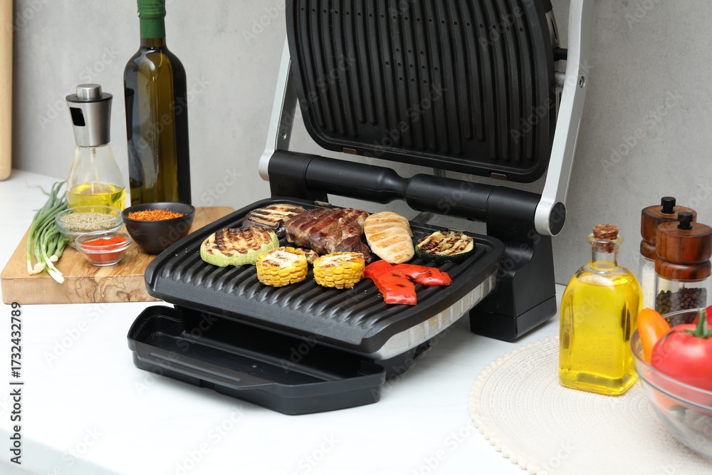 Electric grill with tasty meat, vegetables and spices on white countertop in kitchen