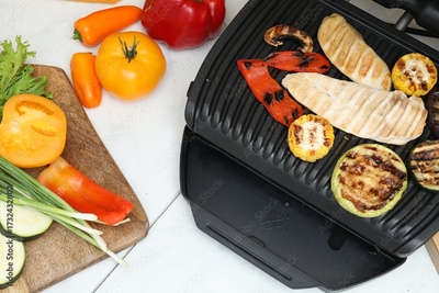 Electric grill with tasty meat and vegetables on white marble table flat lay