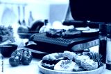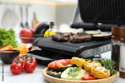 Electric grill with tasty meat, vegetables and spices on white table in kitchen, closeup