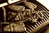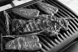 Electric grill with beef steaks, bell peppers and rosemary on white table, closeup