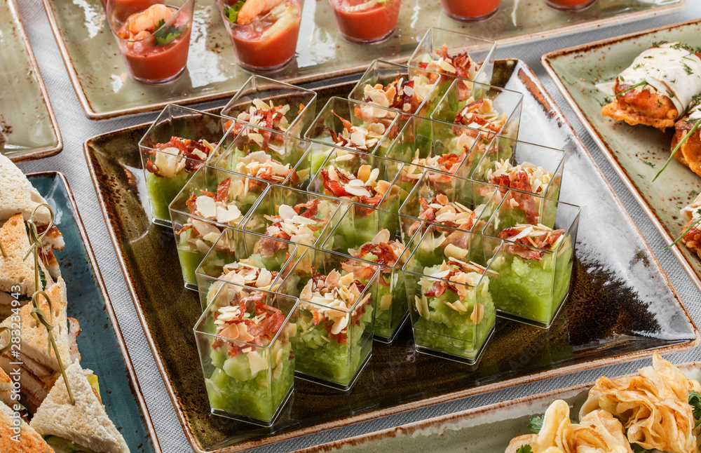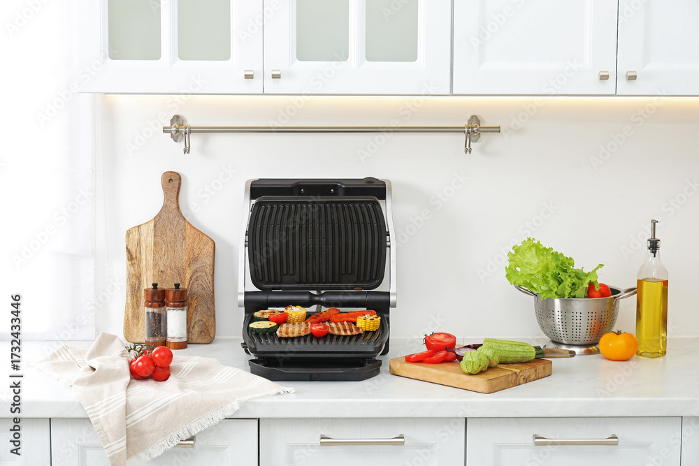 Electric grill with tasty meat and vegetables on white marble table in kitchen