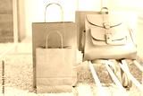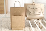 Paper bags near backpack on carpet indoors, closeup