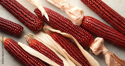 Ripe red corn cobs on light table against, flat lay