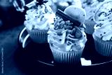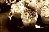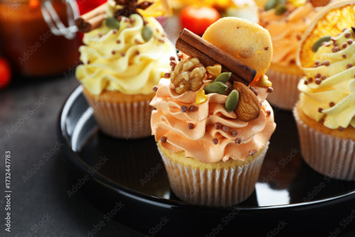 Delicious cupcakes with sprinkles, nuts, cookie and spices on grey table, closeup. Autumn atmosphere