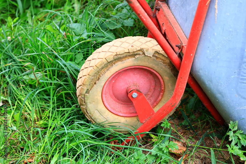 A red wheel is placed on a blue cart in a lush green grass, ready for use