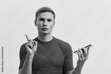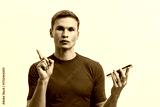 Young caucasian man in red shirt hold smartphone point finger use voice assistant digital technology concept isolated white background studio portrait
