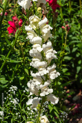 Antirrhinum majus 'Rocket White' a summer autumn fall flowering plant with a yellow springtime flower commonly known as snapdragon, gardening stock photo image