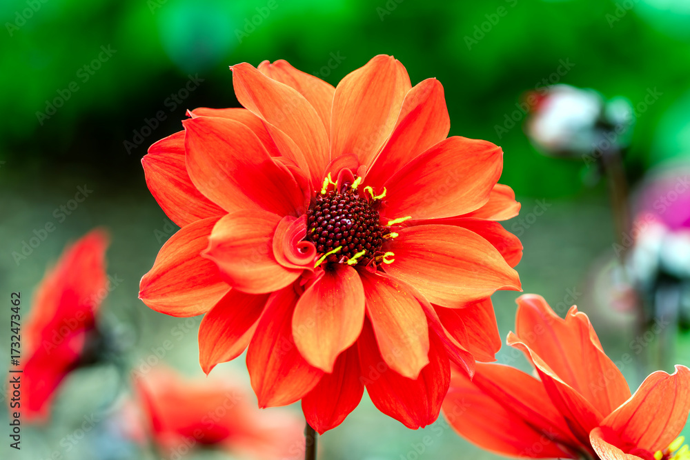 Dahlia 'Bishop of Llandaff' a summer autumn fall flowering tuber plant with a red summertime flower, gardening stock photo image