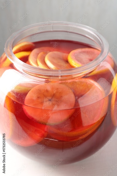 Tasty fruity punch on white table, closeup. Refreshing drink