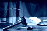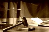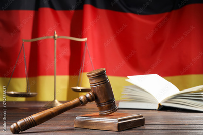 Judge's gavel, book and scales on wooden table against flag of Germany, closeup