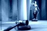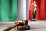 Judge's gavel and statue of Lady Justice on wooden table against flag of Italy, closeup