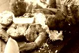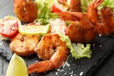 Tasty grilled shrimps with salad on black table, closeup. Delicious seafood dish