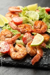 Tasty grilled shrimps with salad on black table, closeup. Delicious seafood dish