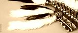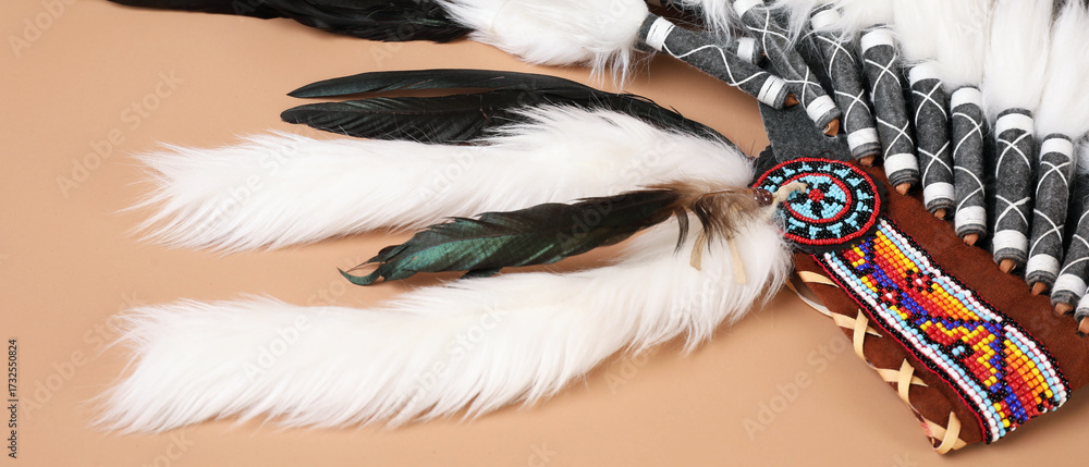 Traditional warbonnet (Native American chief headdress) on beige background, closeup