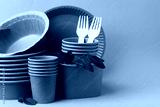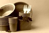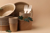 Set of disposable tableware and green leaves on dark beige background, closeup. Space for text