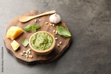 Fresh pesto sauce in bowl, spoon and ingredients on grey table. Space for text