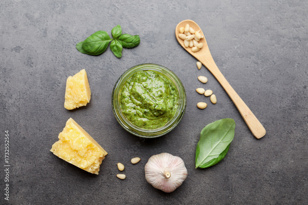 Fresh pesto sauce in jar, spoon and ingredients on grey table, flat lay