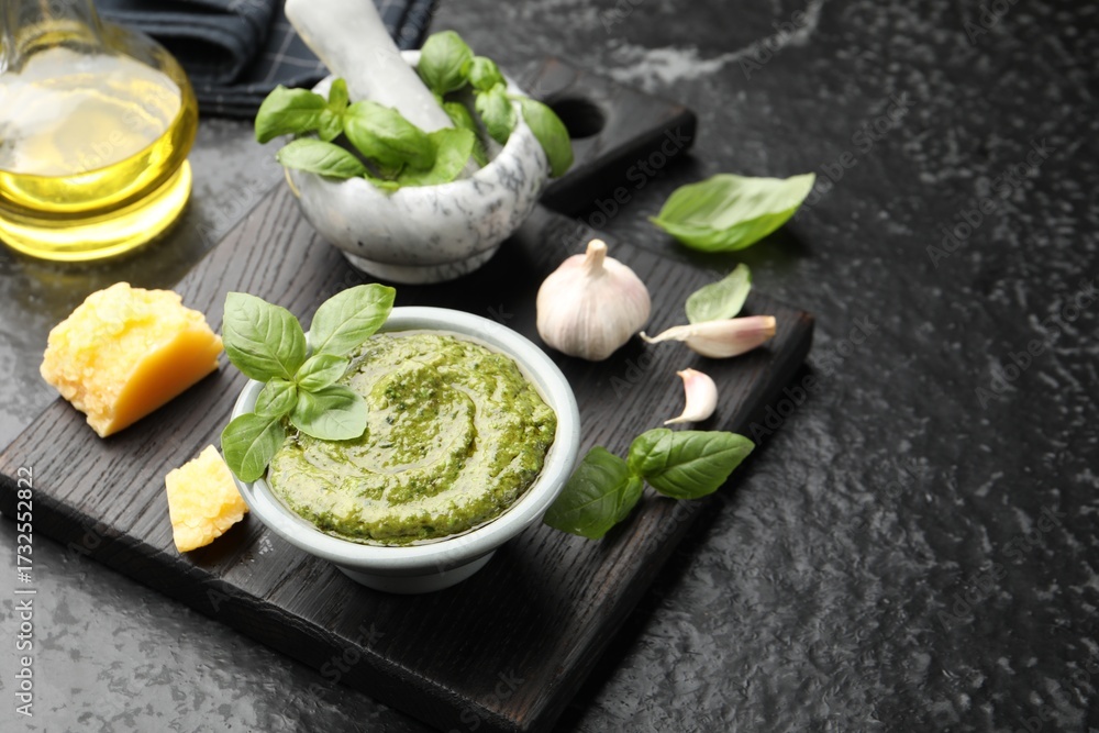 Fresh pesto sauce and ingredients on black textured table
