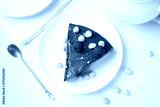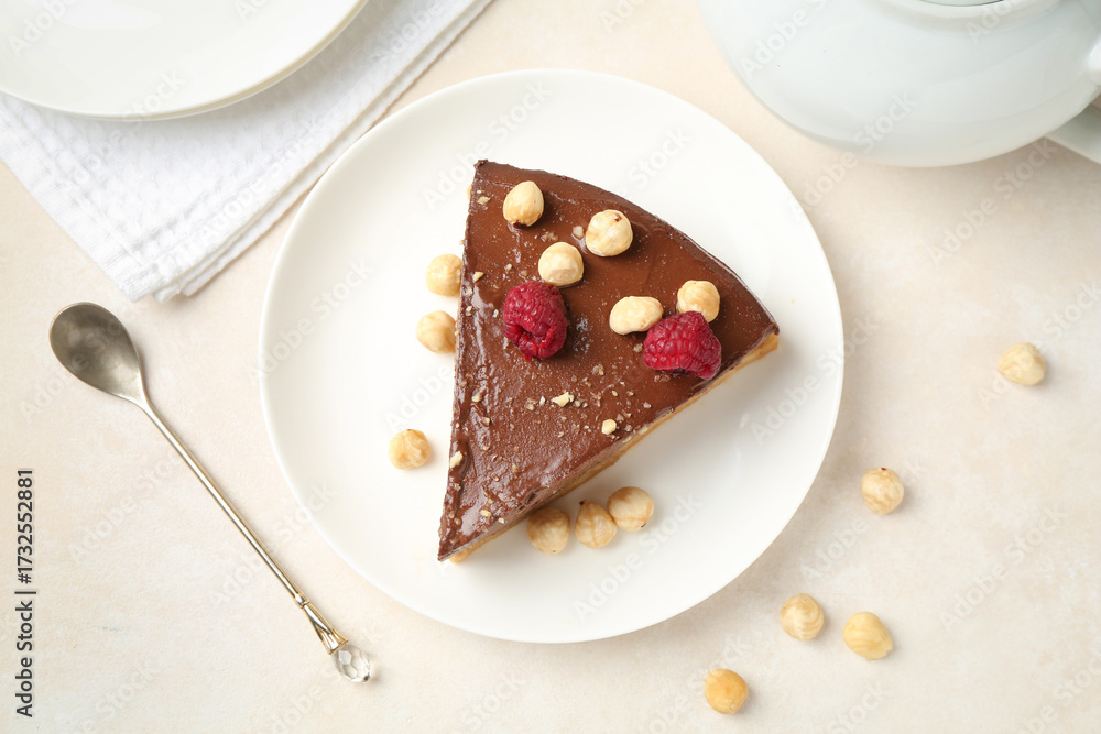 Piece of delicious chocolate cheesecake with nuts and raspberries on beige table, flat lay