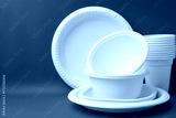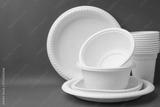Set of disposable plastic tableware on red background, closeup. Space for text