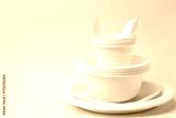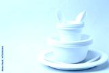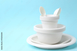 Set of disposable plastic tableware on light blue background, closeup. Space for text