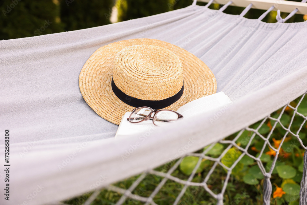 Straw hat, glasses and book on hammock outdoors